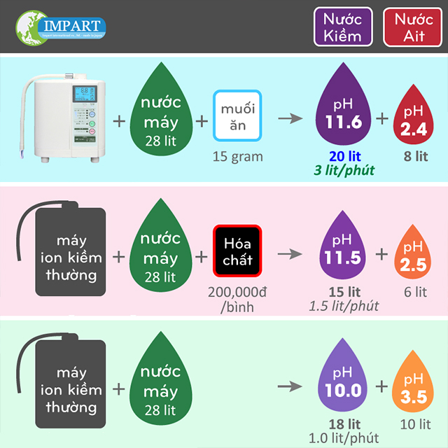 Mặc dù dung dịch hóa chất điện phân cần thiết để tạo nước kiềm và nước axit mạnh nhưng thực sự hiệu quả của những chiếc máy này không cao bằng Impart Excel-FX (MX-99) vì chỉ tạo được độ pH như thông thường là nước ion kiềm mạnh pH 11.5 và nước ion axit pH 2.5. Trong khi đó, Impart Excel-FX (MX-99) có thể tạo được nước ion kiềm mạnh pH 11.6 và nước ion axit pH 2.4.