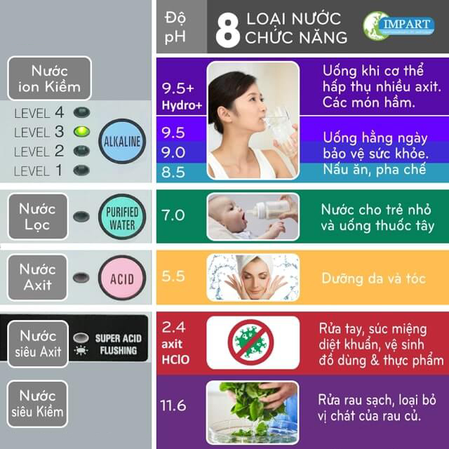 – Nước ion kiềm để uống: 3 cấp độ, pH từ 8.5 – 9.5