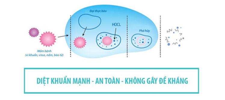 Trong nước ion axit mạnh pH 2.5 có thành phần chính là HCLO. Được hình thành từ việc điện phân dung dịch nước và muối. Do đó, nước ion axit có khả năng tiêu diệt được vi khuẩn bám trên bề mặt.