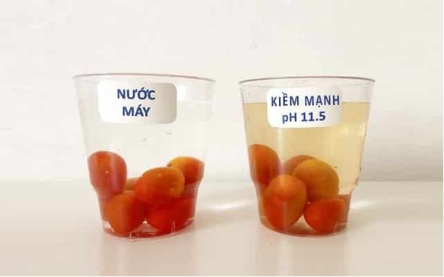 Kế đến, bạn hãy cho rau củ quả, thịt sống… vào nước ion kiềm mạnh pH 11.5 hoặc 11.6.