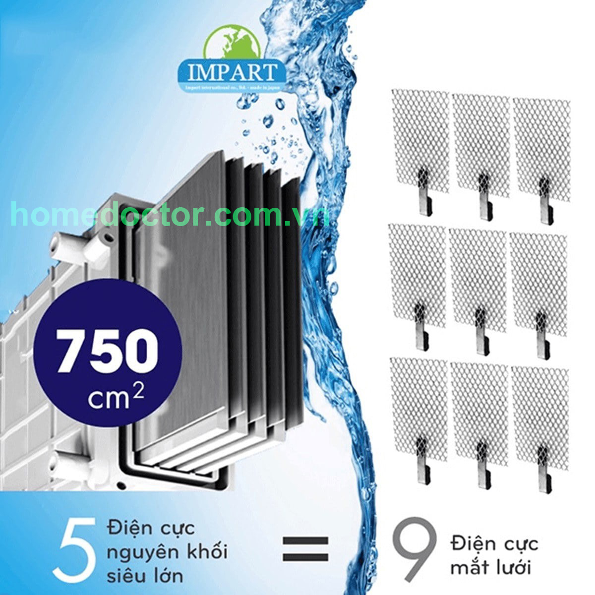 Bên cạnh đó, cấu tạo điện cực trong mỗi máy điện giải luôn được nghiên cứu kỹ lưỡng; đạt chuẩn chất lượng cao với kết cấu hoàn hảo cùng kích thước siêu lớn. Nhờ vậy, tấm điện cực của máy có diện tích tiếp xúc lớn hàng đầu trong ngành ~ 750 cm2. Chỉ với 5 bể điện phân nhưng máy lọc nước ion kiềm Impart; có khả năng làm tăng lượng hydro hòa tan trong nước đến ~ 1400 ppb và tăng độ rộng của dải pH.