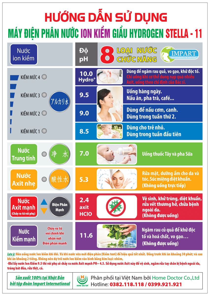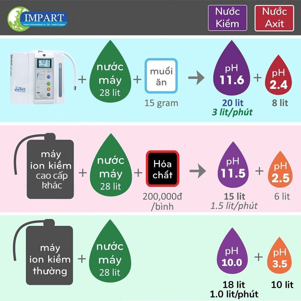 Nhờ chú trọng vào công nghệ điện giải với công suất mạnh; máy lọc nước ion kiềm Impart có thể tạo đến 8 loại nước chức năng; với dải pH ~ 2.4 – 11.6 phục vụ đa nhu cầu.