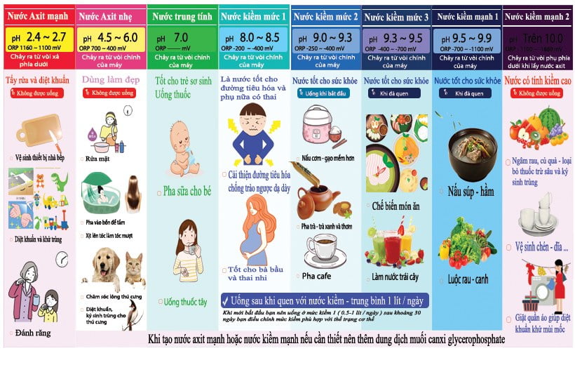 Nước lọc trung tính pH ~ 7.0: Dùng để uống thuốc tây, pha sữa và nấu ăn cho bé. Nước dùng để uống sau khi ăn no.